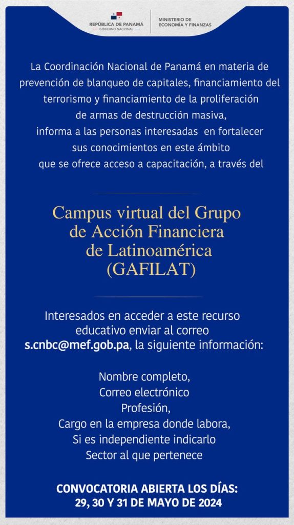 Convocatoria abierta: Coordinación Nacional en materia de BC/FT/FPADM ofrece acceso a capacitación, a través del Campus virtual del GAFI – 29, 30 y 31 de mayo.