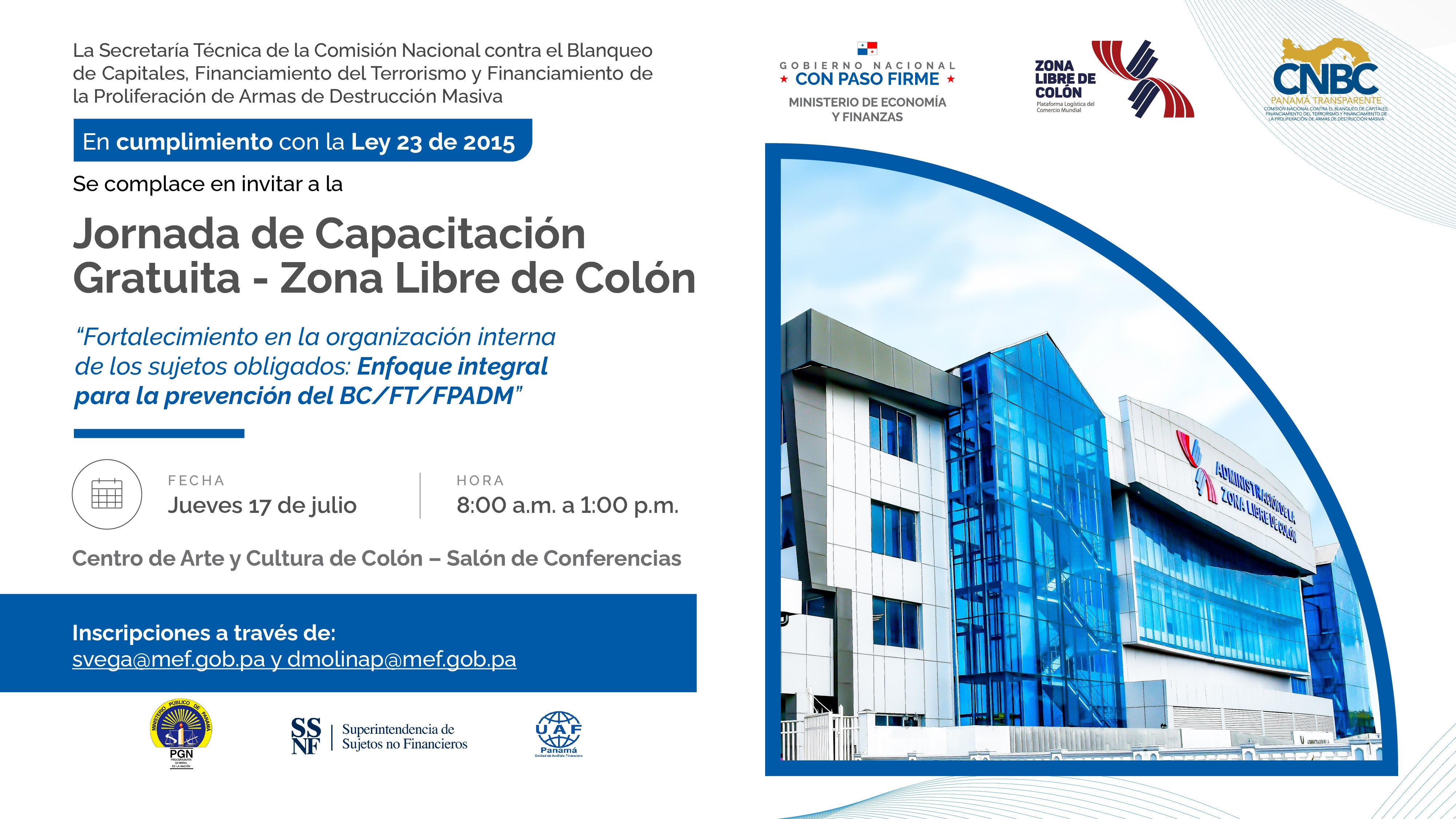 La Secretaría Técnica de la CNBC invita a los sujetos obligados de la Zona Libre de Colón a participar en jornada de capacitación ALA/CFT/CFP
